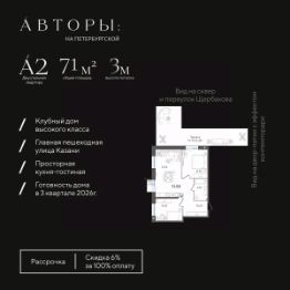 Продается 2-к квартира 28 в клубном доме "Авторы на Петербургской" на главной пешеходной улице Казани. Квартира на 2 этаже площадью 71,55 м², высотой потолков 3 м. Квартира сдается в свободной планировке, предоставляя полную свободу для ваших предпочтений в дизайне и возможность подстроить пространство под ваши жизненные ценности.