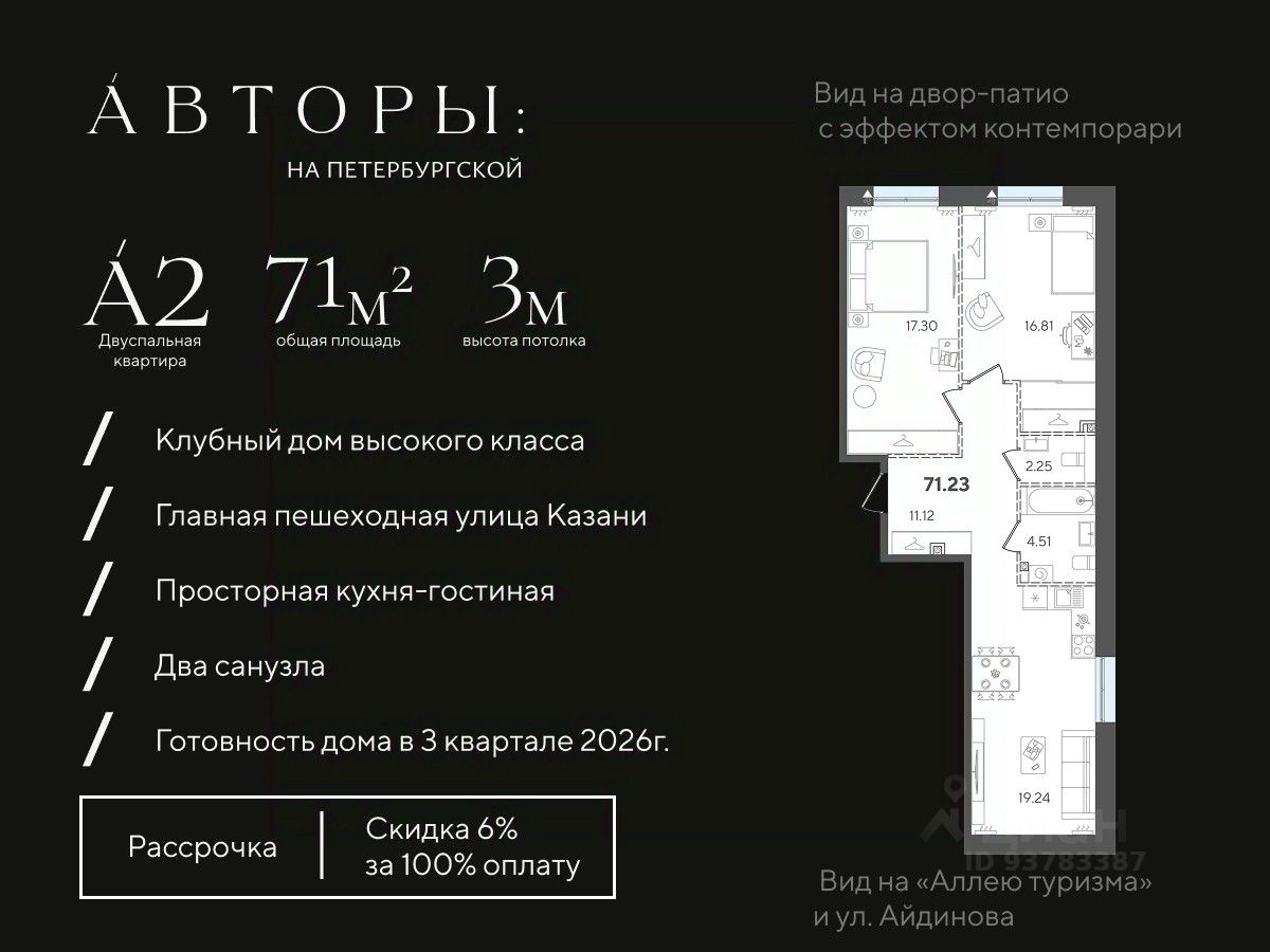 Продается 2-к квартира 37 в клубном доме "Авторы на Петербургской" на главной пешеходной улице Казани. Квартира на 4 этаже площадью 71,23 м², высотой потолков 3 м. Квартира сдается в свободной планировке, предоставляя полную свободу для ваших предпочтений в дизайне и возможность подстроить пространство под ваши жизненные ценности.