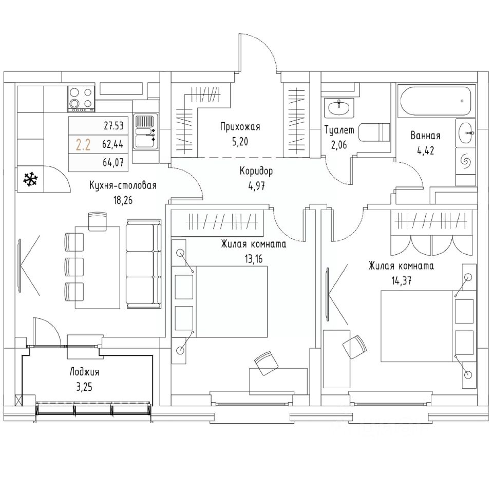Общая площадь64,07 м²