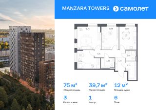 Строим кварталы для жизни с заботой о будущем. Предлагается 3-комнатная квартира комфорт-класса 75 кв.м в корпусе 1 на 6 этаже, в MANZARA TOWERS