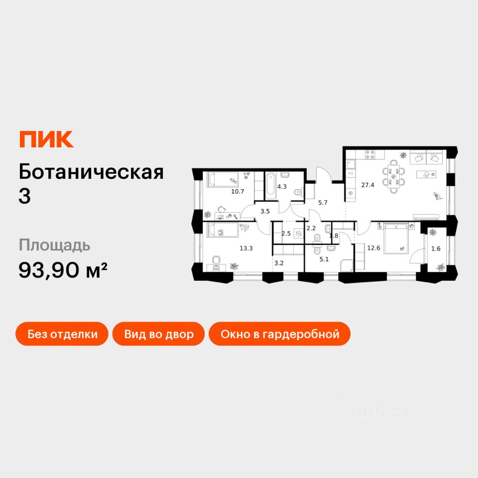 Продаётся 3-комн. квартира площадью 93,9 кв.м на 5 этаже 10 этажного дома (Корпус 2, Секция 7) проекта ПИК Ботаническая 3. Светлый просторный подъезд на уровне земли, функциональная планировка, большие окна, без отделки.