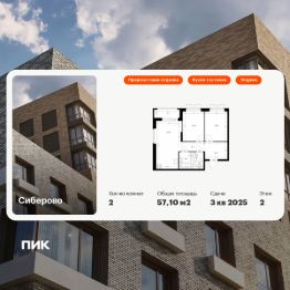 Продаётся 2-комн. квартира площадью 57,1 кв.м на 2 этаже 11 этажного дома (Корпус 1, Секция 4) проекта ПИК Сиберово. Светлый просторный подъезд на уровне земли, функциональная планировка, большие окна, предчистовая отделка.