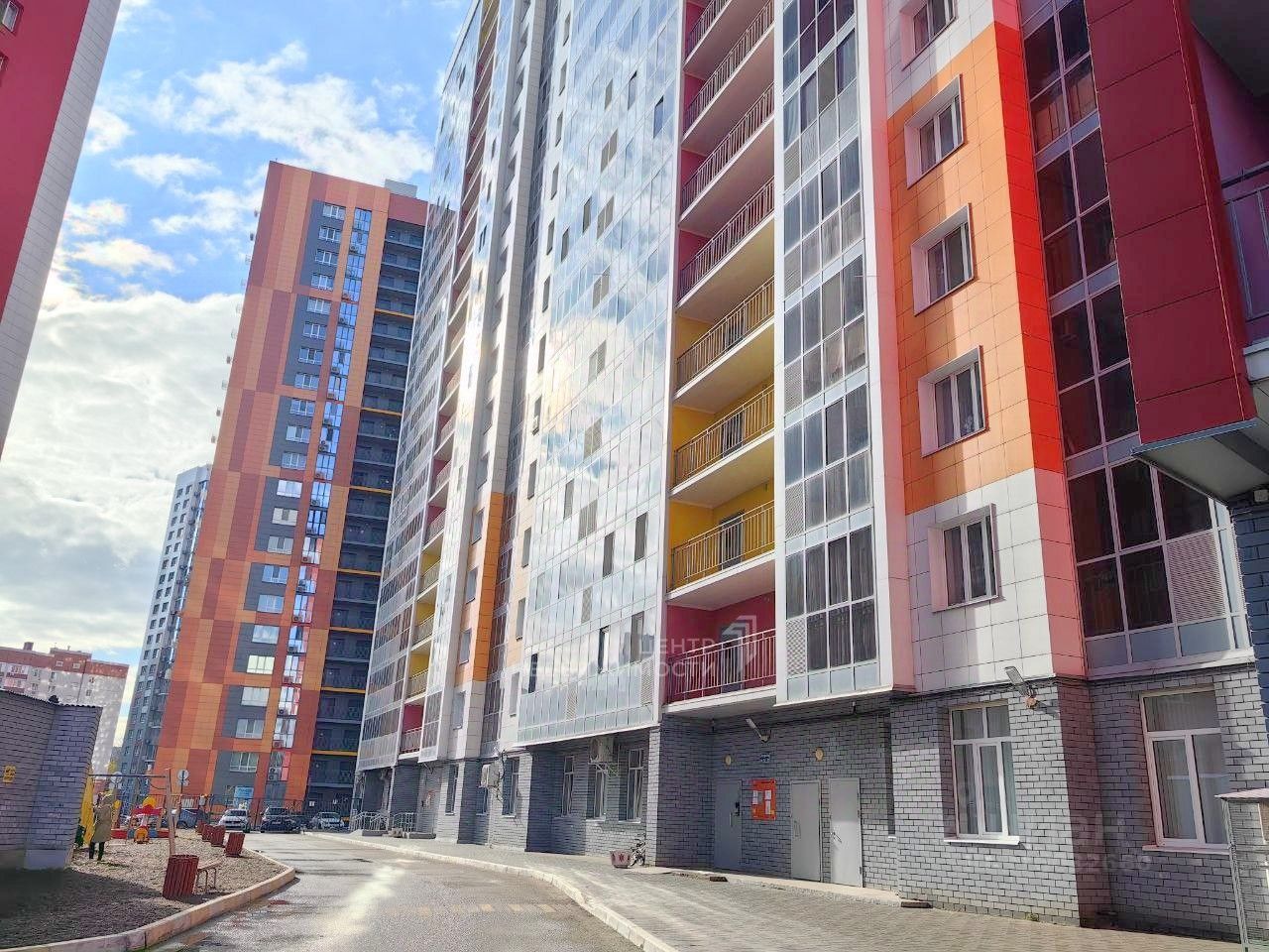 Во дворе детская и спортивные площадки, где дети могут играть и заниматься спортом.