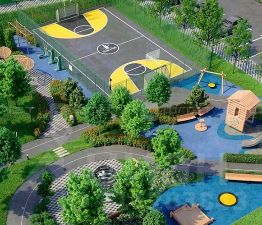 Закрытый двор с детскими игровыми и спортивными площадками, для удобства разделенный на 2 локации.