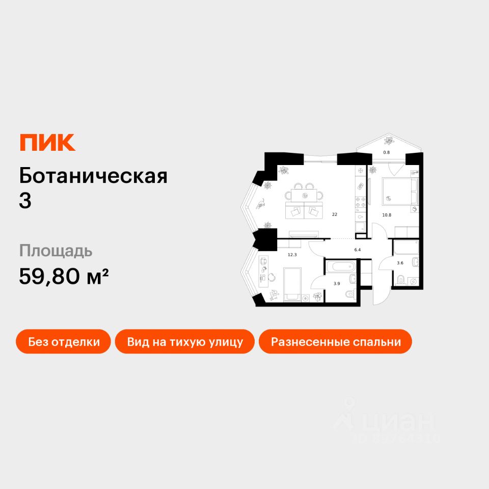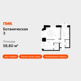 Продаётся 2-комн. квартира площадью 59,8 кв.м на 7 этаже 15 этажного дома (Корпус 2, Секция 9) проекта ПИК Ботаническая 3. Светлый просторный подъезд на уровне земли, функциональная планировка, большие окна, без отделки.
