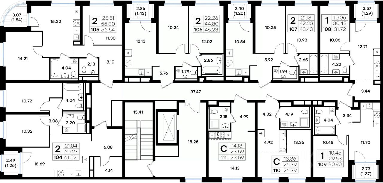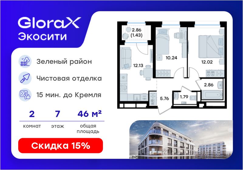 Продается 2-комн. квартира на 7-м этаже в строящемся проекте GloraX Экосити. Общая площадь лота составляет 46,23 кв. м, из которых 22,26 кв. м отведено под жилую и 12,13 кв. м под кухонную зону. Номер квартиры - 106