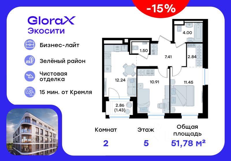 Продается 2-комн. квартира на 5-м этаже в строящемся проекте GloraX Экосити. Общая площадь лота составляет 51,78 кв. м, из которых 22,36 кв. м отведено под жилую и 12,24 кв. м под кухонную зону. Номер квартиры - 165