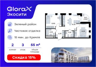Продается 2-комн. квартира на 3-м этаже в строящемся проекте GloraX Экосити. Общая площадь лота составляет 55,56 кв. м, из которых 24,92 кв. м отведено под жилую и 15,20 кв. м под кухонную зону. Номер квартиры - 363