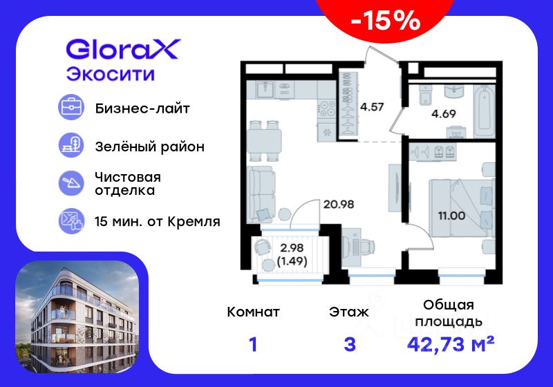 Продается 1-комн. квартира на 3-м этаже в строящемся проекте GloraX Экосити. Общая площадь лота составляет 42,73 кв. м, из которых 11,00 кв. м отведено под жилую и 20,98 кв. м под кухонную зону. Номер квартиры - 327
