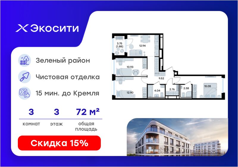 Продается 3-комн. квартира на 3-м этаже в строящемся проекте Экосити. Общая площадь лота составляет 72,60 кв. м, из которых 38,88 кв. м отведено под жилую и 12,94 кв. м под кухонную зону. Номер квартиры - 295