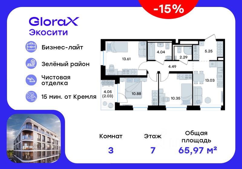 Продается 3-комн. квартира на 7-м этаже в строящемся проекте GloraX Экосити. Общая площадь лота составляет 65,97 кв. м, из которых 34,84 кв. м отведено под жилую и 13,03 кв. м под кухонную зону. Номер квартиры - 348