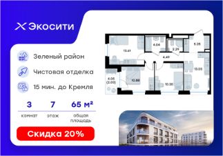 Продается 3-комн. квартира на 7-м этаже в строящемся проекте Экосити. Общая площадь лота составляет 65,97 кв. м, из которых 34,84 кв. м отведено под жилую и 13,03 кв. м под кухонную зону. Номер квартиры - 348
