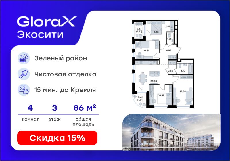 Продается 4-комн. квартира на 3-м этаже в строящемся проекте GloraX Экосити. Общая площадь лота составляет 86,09 кв. м, из которых 44,80 кв. м отведено под жилую и 20,53 кв. м под кухонную зону. Номер квартиры - 367