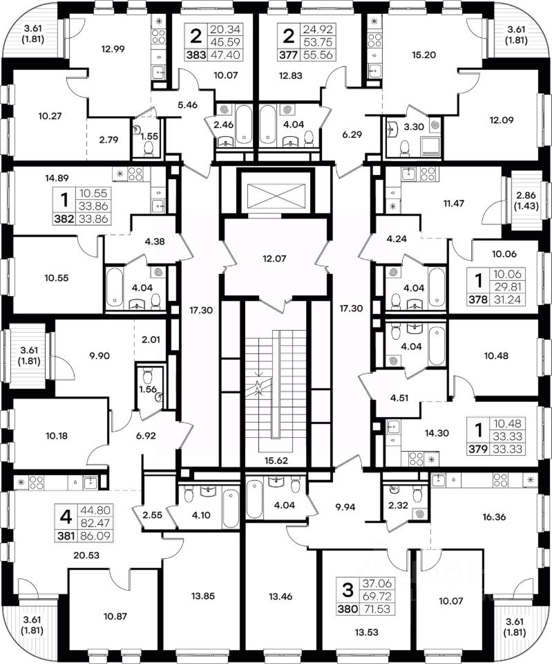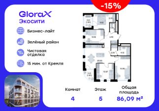 Продается 4-комн. квартира на 5-м этаже в строящемся проекте GloraX Экосити. Общая площадь лота составляет 86,09 кв. м, из которых 44,80 кв. м отведено под жилую и 20,53 кв. м под кухонную зону. Номер квартиры - 381