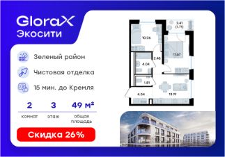 Продается 2-комн. квартира на 3-м этаже в строящемся проекте GloraX Экосити. Общая площадь лота составляет 49,00 кв. м, из которых 21,73 кв. м отведено под жилую и 13,19 кв. м под кухонную зону. Номер квартиры - 291