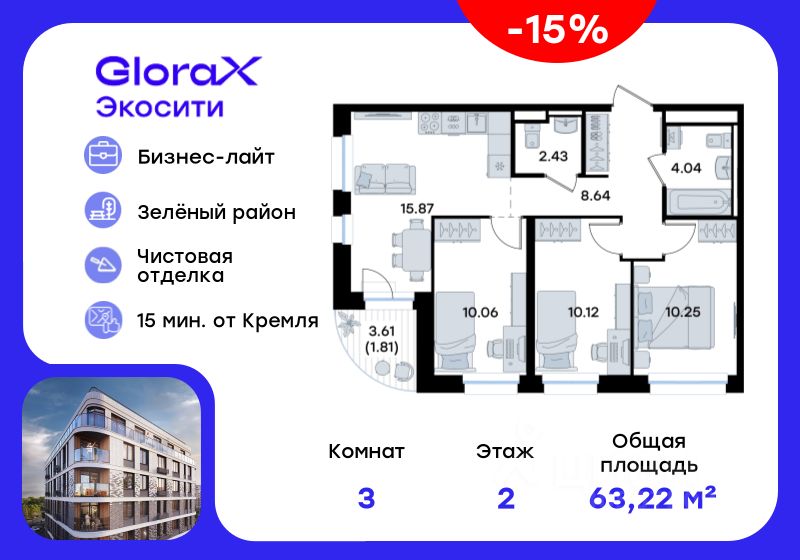 Продается 3-комн. квартира на 2-м этаже в строящемся проекте GloraX Экосити. Общая площадь лота составляет 63,22 кв. м, из которых 30,43 кв. м отведено под жилую и 15,87 кв. м под кухонную зону. Номер квартиры - 410