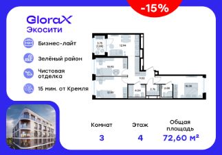 Продается 3-комн. квартира  на 4-м этаже в строящемся проекте GloraX Экосити. Общая площадь лота составляет 72,60 кв. м, из которых 38,88 кв. м отведено под жилую и 12,94 кв. м под кухонную зону. Номер квартиры - 301