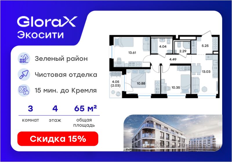 Продается 3-комн. квартира на 4-м этаже в строящемся проекте GloraX Экосити. Общая площадь лота составляет 65,97 кв. м, из которых 34,84 кв. м отведено под жилую и 13,03 кв. м под кухонную зону. Номер квартиры - 333