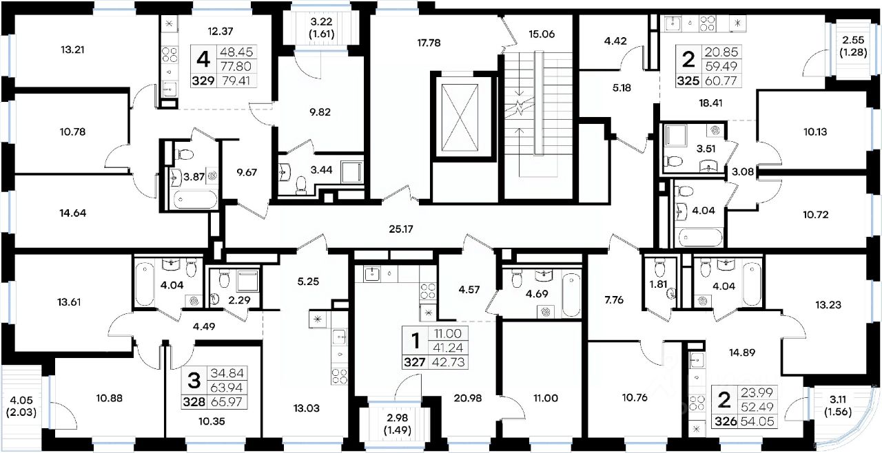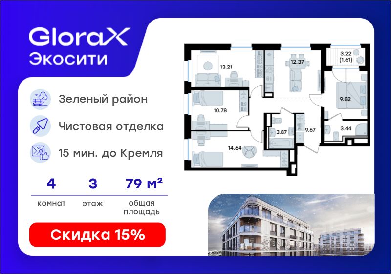 Продается 4-комн. квартира на 3-м этаже в строящемся проекте GloraX Экосити. Общая площадь лота составляет 79,41 кв. м, из которых 48,45 кв. м отведено под жилую и 12,37 кв. м под кухонную зону. Номер квартиры - 329