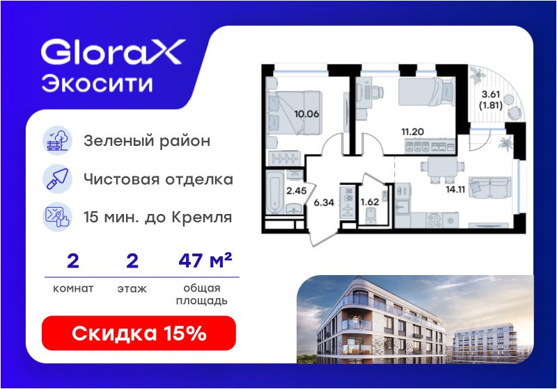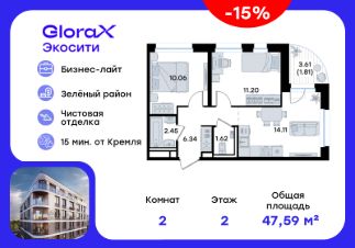 Продается 2-комн. квартира на 2-м этаже в строящемся проекте GloraX Экосити. Общая площадь лота составляет 47,59 кв. м, из которых 21,26 кв. м отведено под жилую и 14,11 кв. м под кухонную зону. Номер квартиры - 414