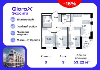 Продается 3-комн. квартира на 3-м этаже в строящемся проекте GloraX Экосити. Общая площадь лота составляет 63,22 кв. м, из которых 30,43 кв. м отведено под жилую и 15,87 кв. м под кухонную зону. Номер квартиры - 425