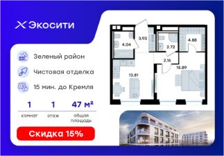 Продается 1-комн. квартира на 1-м этаже в строящемся проекте Экосити. Общая площадь лота составляет 47,43 кв. м, из которых 15,89 кв. м отведено под жилую и 13,81 кв. м под кухонную зону. Номер квартиры - 128