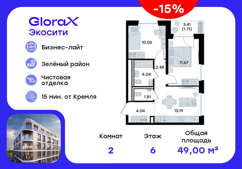 Продается 2-комн. квартира на 6-м этаже в строящемся проекте GloraX Экосити. Общая площадь лота составляет 49,00 кв. м, из которых 21,73 кв. м отведено под жилую и 13,19 кв. м под кухонную зону. Номер квартиры - 309