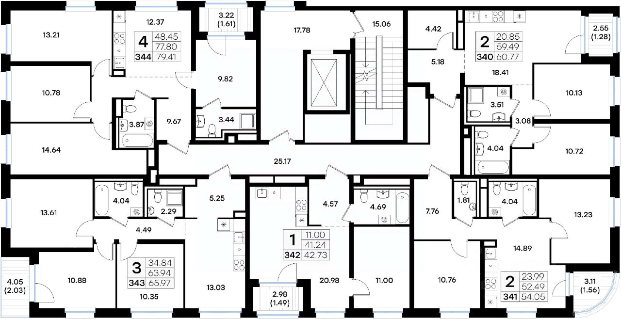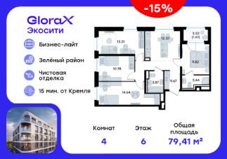 Продается 4-комн. квартира на 6-м этаже в строящемся проекте GloraX Экосити. Общая площадь лота составляет 79,41 кв. м, из которых 48,45 кв. м отведено под жилую и 12,37 кв. м под кухонную зону. Номер квартиры - 344