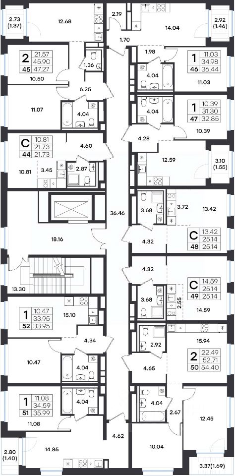 Продается 2-комн. квартира на 6-м этаже в строящемся проекте GloraX Экосити. Общая площадь лота составляет 47,27 кв. м, из которых 21,57 кв. м отведено под жилую и 12,68 кв. м под кухонную зону. Номер квартиры - 45
