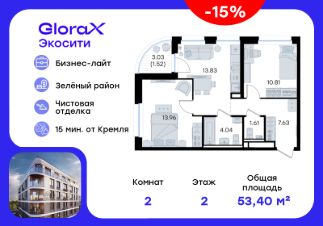 Продается 2-комн. квартира на 2-м этаже в строящемся проекте GloraX Экосити. Общая площадь лота составляет 53,40 кв. м, из которых 24,77 кв. м отведено под жилую и 13,83 кв. м под кухонную зону. Номер квартиры - 172