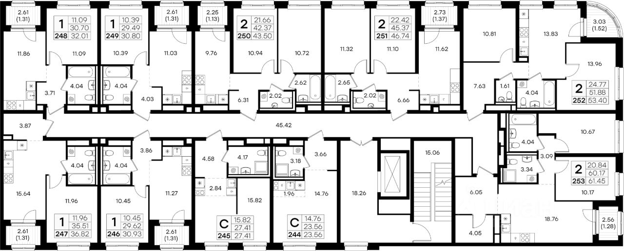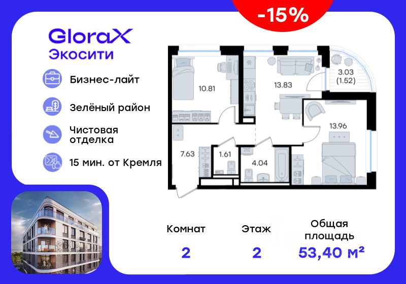 Продается 2-комн. квартира на 2-м этаже в строящемся проекте GloraX Экосити. Общая площадь лота составляет 53,40 кв. м, из которых 24,77 кв. м отведено под жилую и 13,83 кв. м под кухонную зону. Номер квартиры - 252
