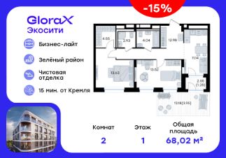 Продается 2-комн. квартира  на 1-м этаже в строящемся проекте GloraX Экосити. Общая площадь лота составляет 68,02 кв. м, из которых 27,15 кв. м отведено под жилую и 11,14 кв. м под кухонную зону. Номер квартиры - 170