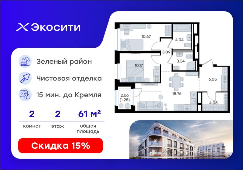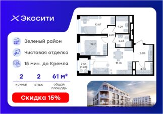 Продается 2-комн. квартира на 2-м этаже в строящемся проекте Экосити. Общая площадь лота составляет 61,45 кв. м, из которых 20,84 кв. м отведено под жилую и 18,76 кв. м под кухонную зону. Номер квартиры - 171