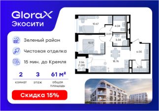 Продается 2-комн. квартира на 3-м этаже в строящемся проекте GloraX Экосити. Общая площадь лота составляет 61,45 кв. м, из которых 20,84 кв. м отведено под жилую и 18,76 кв. м под кухонную зону. Номер квартиры - 181
