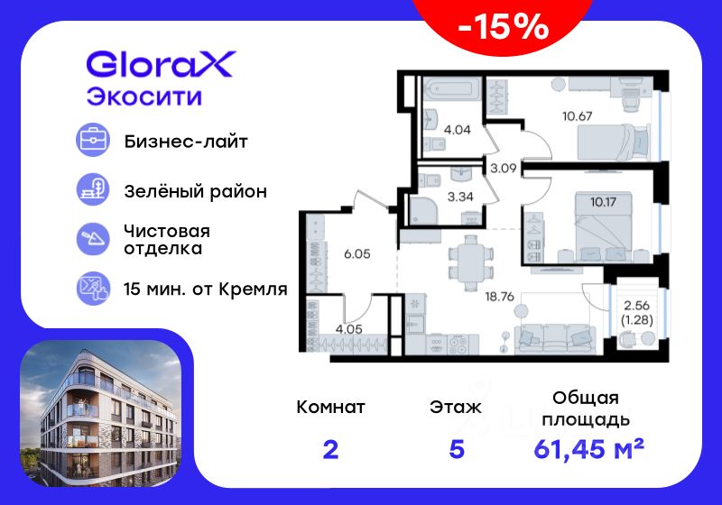 Продается 2-комн. квартира на 5-м этаже в строящемся проекте GloraX Экосити. Общая площадь лота составляет 61,45 кв. м, из которых 20,84 кв. м отведено под жилую и 18,76 кв. м под кухонную зону. Номер квартиры - 283