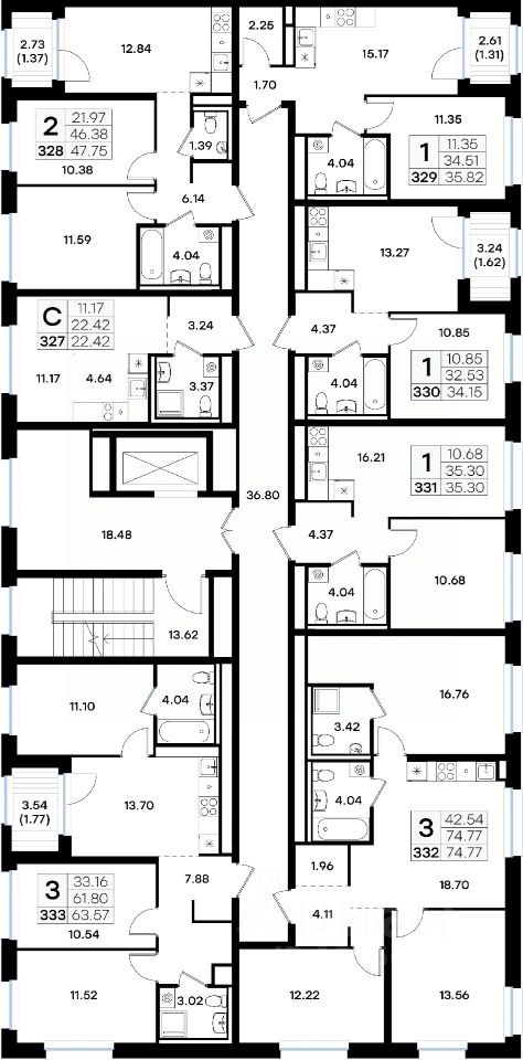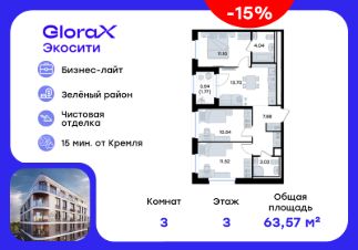 Продается 3-комн. квартира на 3-м этаже в строящемся проекте GloraX Экосити. Общая площадь лота составляет 63,57 кв. м, из которых 33,16 кв. м отведено под жилую и 13,70 кв. м под кухонную зону. Номер квартиры - 333
