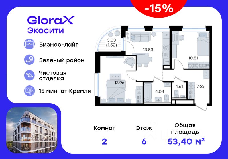 Продается 2-комн. квартира на 6-м этаже в строящемся проекте GloraX Экосити. Общая площадь лота составляет 53,40 кв. м, из которых 24,77 кв. м отведено под жилую и 13,83 кв. м под кухонную зону. Номер квартиры - 212