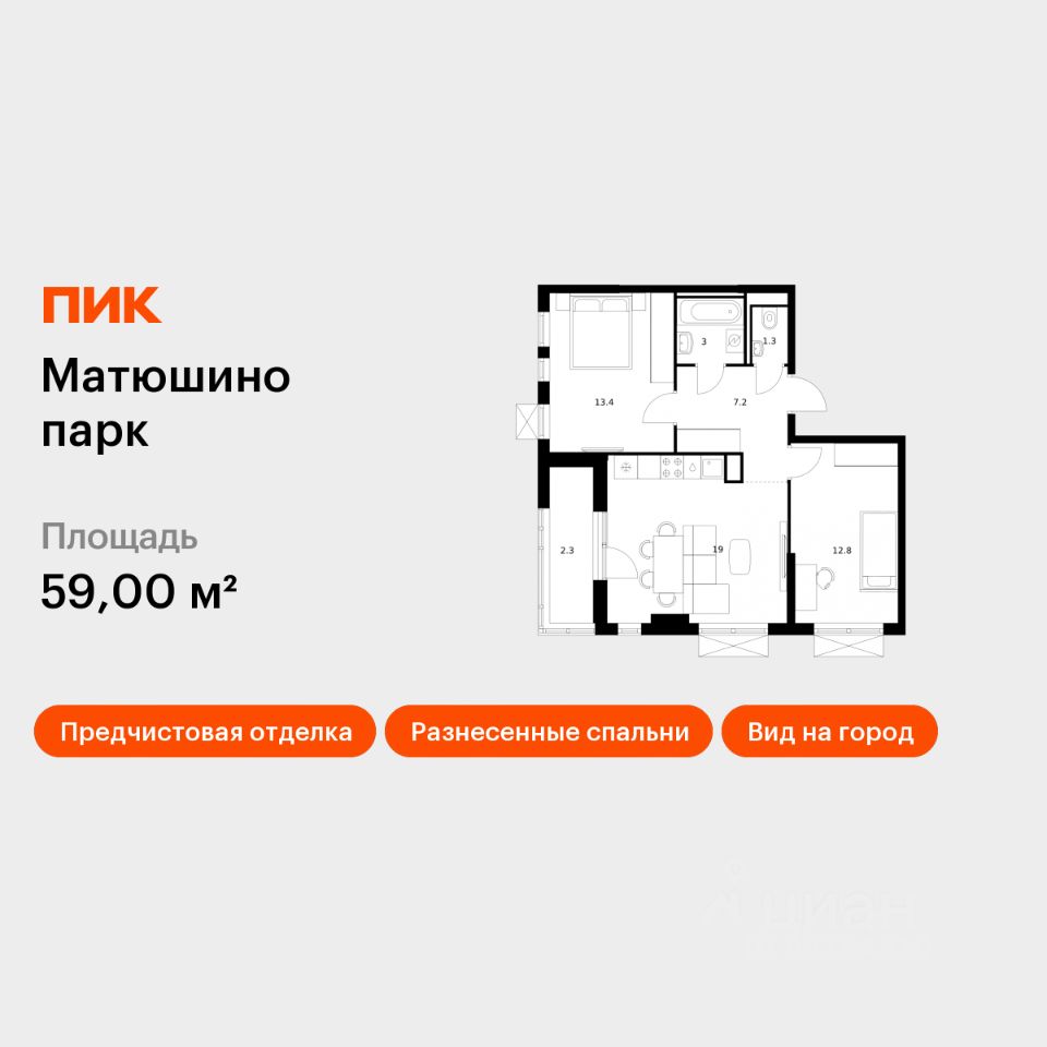 Продаётся 2-комн. квартира площадью 59 кв.м на 14 этаже 22 этажного дома (Корпус 2, Секция 1) проекта ПИК Матюшино парк. Светлый просторный подъезд на уровне земли, функциональная планировка, большие окна, предчистовая отделка.