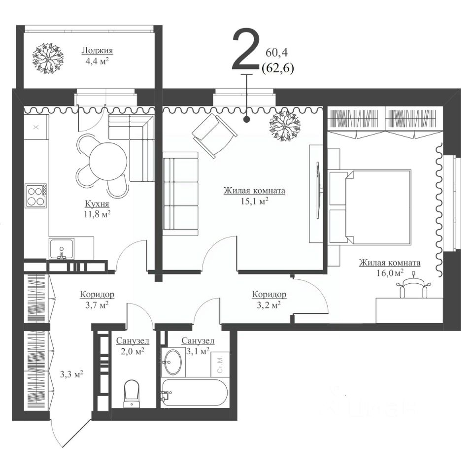 60,8 м²