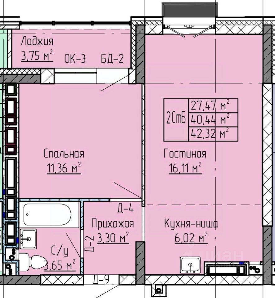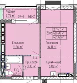 Продаётся 2-комнатная квартира в строящемся доме (Дом 12), срок сдачи: IV-кв. 2026, общей площадью 42.32 кв.м., на 19 этаже.