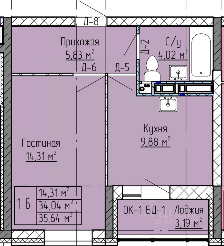 1-комн. квартира, 35,64 м²