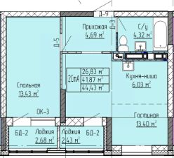 Продаётся 2-комнатная квартира в строящемся доме (Дом 12), срок сдачи: IV-кв. 2026, общей площадью 44.43 кв.м., на 6 этаже.