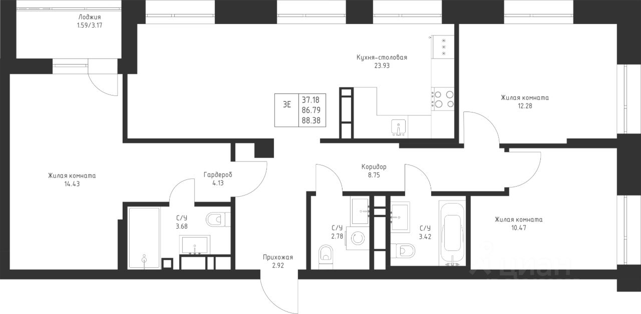Прекрасное решение для семьи 3 санузла и место под шкаф-купе в коридоре, чтобы вам было удобно хранить свои вещи. В квартире предусмотрена лоджия, на которой можно организовать уютное место для отдыха.