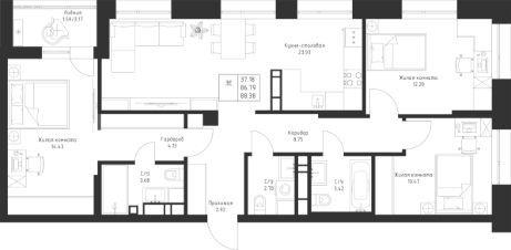 Прекрасное решение для семьи  3 санузла и место под шкаф-купе в коридоре, чтобы вам было удобно хранить свои вещи. В квартире предусмотрена лоджия, на которой можно организовать уютное место для отдыха.