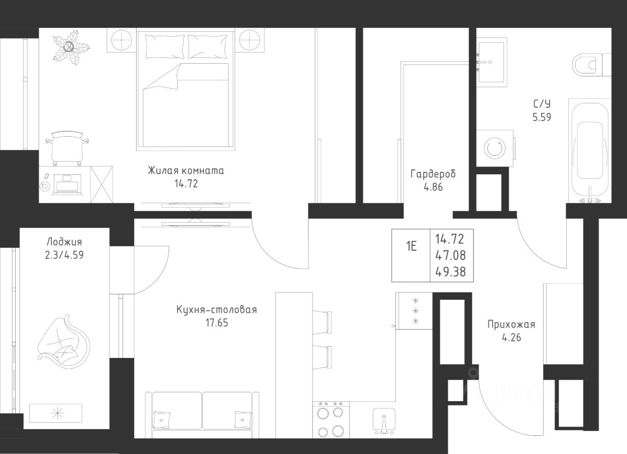 Кухня расположена в нише, чтобы вам было удобно зонировать пространство гостиной. В квартире предусмотрена лоджия, на которой можно организовать уютное место для отдыха. Вместительная ванная комната позволяет разместить как душевую кабину, так и полноценную ванную.