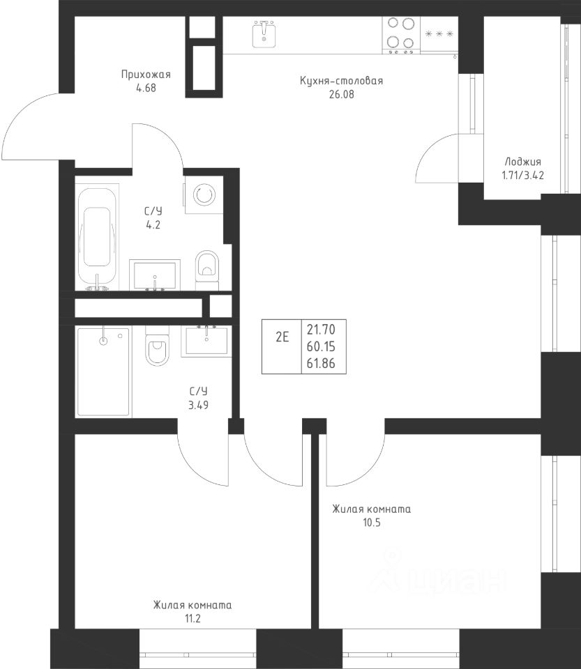 Просторная 2-комнатная квартира с евро-кухней и двумя санузлами. Площадь комнат позволяет зонировать пространство так, как необходимо именно вам.