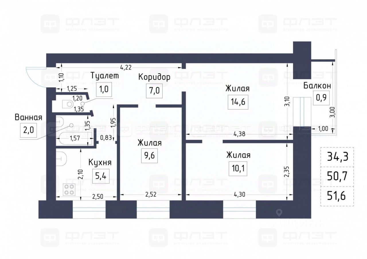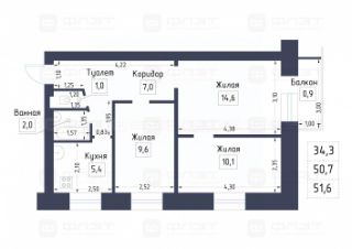 Общaя площадь 50.7 кв.м без учета балкона, площадь с балконом 51,6 кв.м