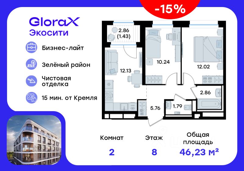 Продается 2-комн. квартира на 8-м этаже в строящемся проекте GloraX Экосити. Общая площадь лота составляет 46,23 кв. м, из которых 22,26 кв. м отведено под жилую и 12,13 кв. м под кухонную зону. Номер квартиры - 114
