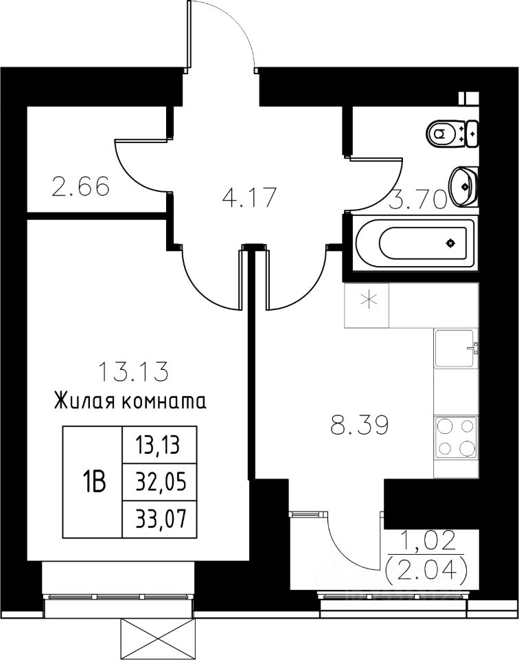 Продается 1 комнатная квартира 125 общей площадью: 33.07 кв.м. на 2 этаже.