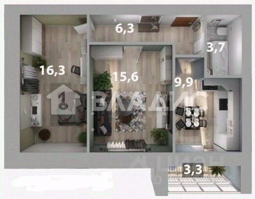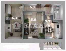 В квартире две изолированные комнаты площадью 15,6 и 16,35 квадратных метров, кухня — 9,95 квадратных метров. Совмещённый санузел.